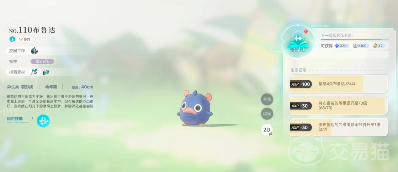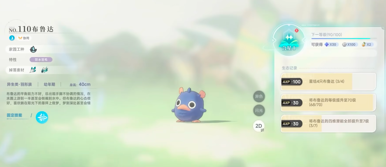 布鲁达具备鲜明的生态定位:家园工种专精矿石采集。尽管肢体协调性较弱,但飞行潜质突出,基础战斗技能以水弹攻击为主。触发合星进化需同步达成三项条件:第一,集齐四只布鲁达(星结);第二,个体等级提升至70级;第三,力量、速度、耐力、灵能四项潜能全部升至7级。每项任务完成后分别奖励100、30、30点经验值,累计160点经验用于推进进化进程。