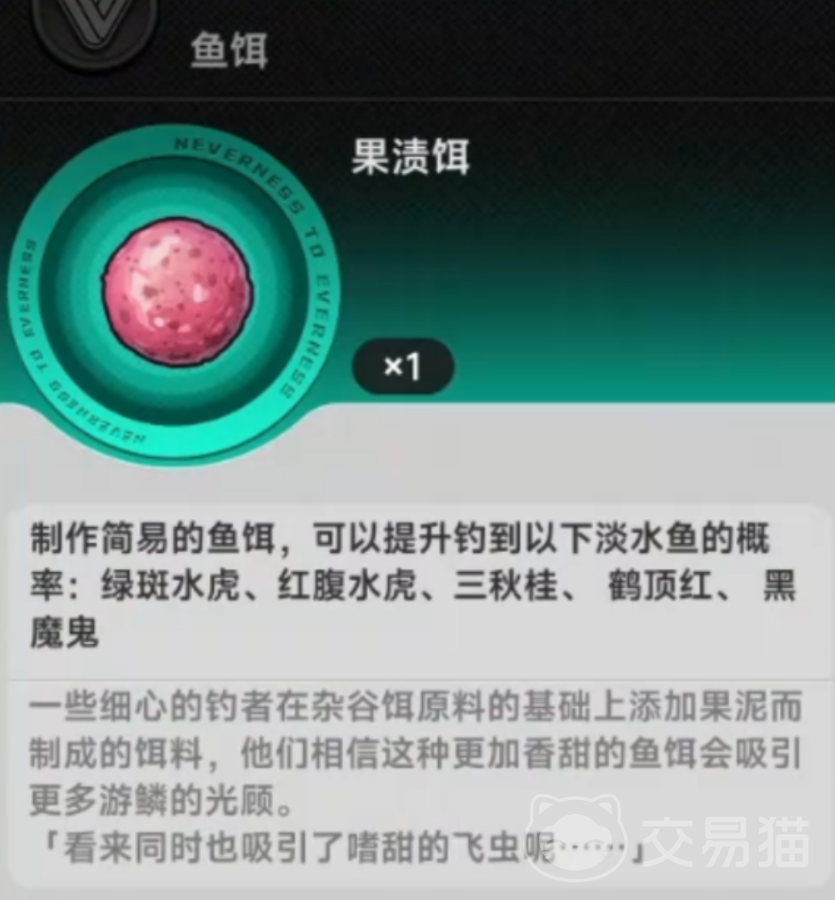 进入中后期内容后,若需定向捕获稀有鱼种,则需启用高适配性饵料——果渍饵。其核心成分包含经天然泥层长期发酵所得的有机浸出物,气味扩散范围广、持续时间长,对特定高价值目标具备强诱导性。实测数据显示,该饵在对应钓点可显著提升绿斑水虎、红腹水虎、三秋桂、鹤顶红等稀有鱼种的咬钩率,是图鉴收集、成就达成及特殊道具兑换环节的关键支撑。