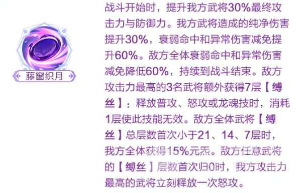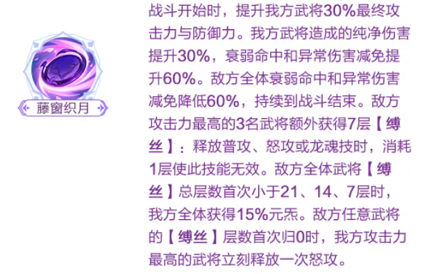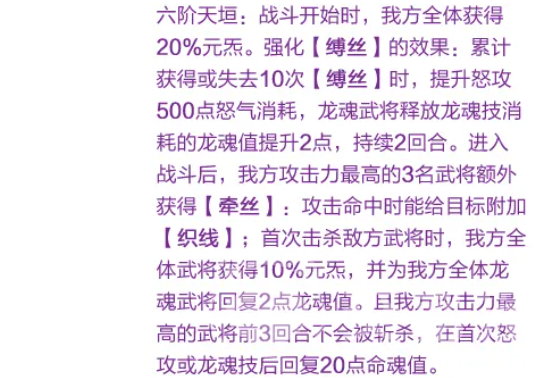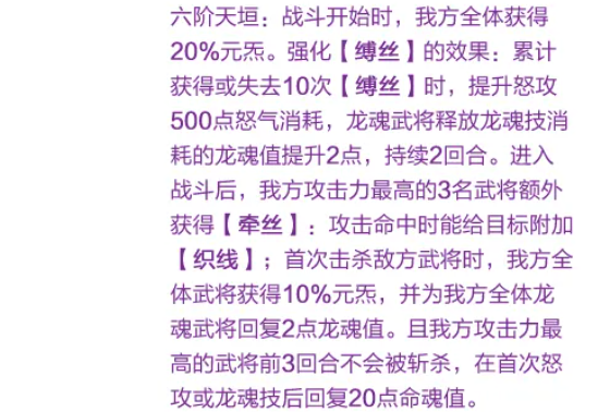 进入战斗后,我方攻击力最高的三名武将还将额外获得“牵线”状态。该状态下,每次攻击命中均可为目标附加1层“织线”。当我方首次击杀敌方单位时,全体武将获得10%元炁,并为所有龙魂武将回复2点龙魂值。此外,我方攻击力最高的武将在前3回合内免疫斩杀;在其首次释放怒攻或龙魂技后,还将恢复20点命魂值。