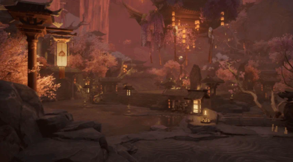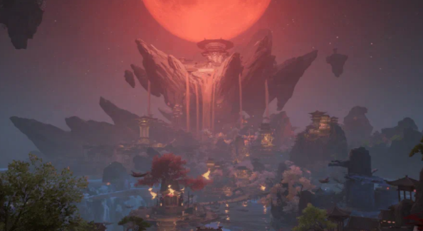 叱罗诡市是整部作品中最具代表性的妖界主城,其视觉语言以“双月映照”为标志性意象——赤月悬空,白月沉渊,二者交叠营造出浓烈的诡谲张力。整个区域划分为三大立体空间层:悬浮于夜空之上的月下叱罗台、铺展于地表的平原市集,以及隐匿于水下的幽冥坊市。玩家需借助特定交互道具实现跨层通行,在明暗交错、虚实共生的动线中推进探索。设计上刻意融合繁盛与凋零的双重质感:朱漆雕梁旁可见蛛网垂落,喧闹摊贩侧立着残碑断碣,强化中式奇谭特有的反差美学体验。