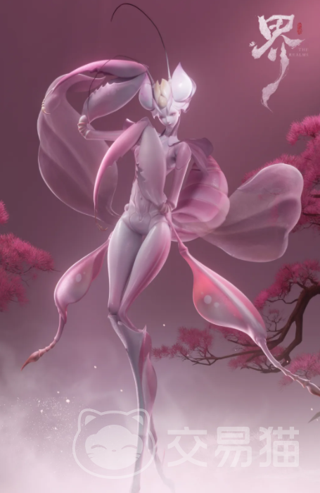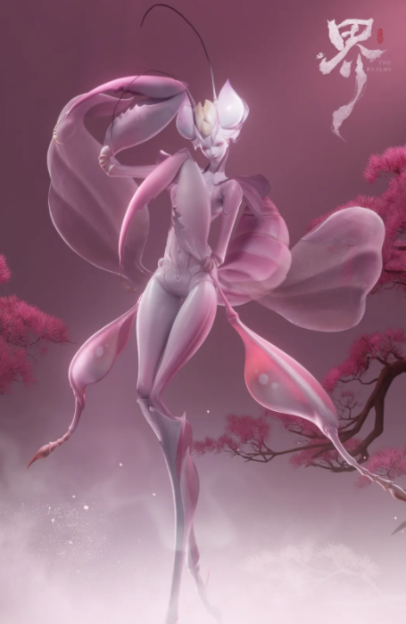 “九畹螳娘”取意自楚辞香草体系,以粉黛柔色掩锋芒之质。其形纤秀,衣袂飘然,周身萦绕兰香凝露,看似温婉可亲;实则为深谙诱杀之道的掠食者——借香气引动情思,待目标心神松懈之际,双镰骤出,断骨取髓,维系自身妖力流转。另一角色“请夜姝”,原型为扑火飞蛾,擅以清越歌喉编织情网,语句绵长如丝,步步设陷。凡为其声所惑者,心旌摇曳之时,魂魄渐染蛾翼之纹,终化为其羽翼下永锢之影。