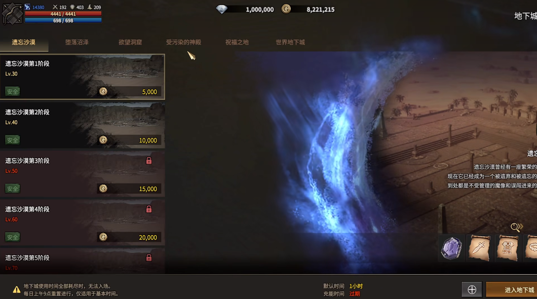 地下城采用限时挑战机制:单次进入拥有60分钟倒计时,期间击杀目标怪物即可结算奖励;若时间耗尽则强制退出,系统将于次日9:00整点重置入口。值得注意的是,倒计时全程不可暂停,即使中途离线亦持续运行。因此建议玩家在角色练度达标、技能组合成熟后再投入高层数挑战。当前版本共设12层地下城地图,难度呈阶梯式递增,各层怪物强度、机制复杂度与掉落品质均有明确区分,需依据自身战力理性选择目标层级,确保资源获取效率最大化。