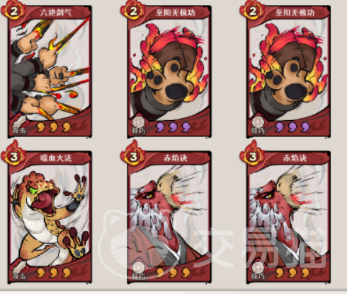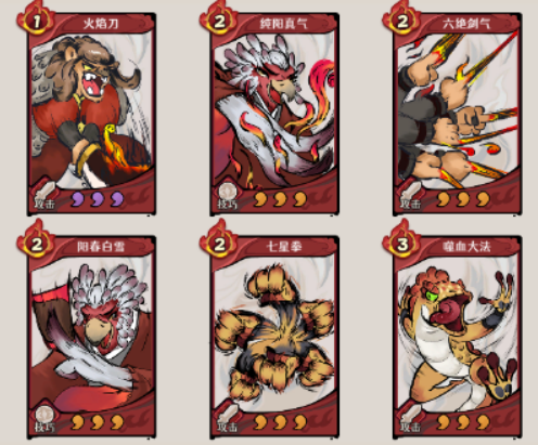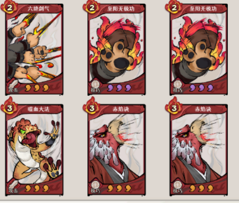 卡组设计体现明确功能分层:「火焰刀」「纯阳真气」「六绝剑气」为灼烧直接施加卡,是前期层数积累的主要载体;「噬血大法」属特殊机制卡,虽作用于己方单位,但可与「赤焰诀」联动触发三重收益——1点怒气即可抽牌、激活「赤焰诀」减怒效果、并为「七星拳」提供额外伤害判定条件;「至阳无极功」「赤焰诀」「阳春白雪」则统一归类为抽牌引擎,共同维持手牌循环效率与战术容错空间。