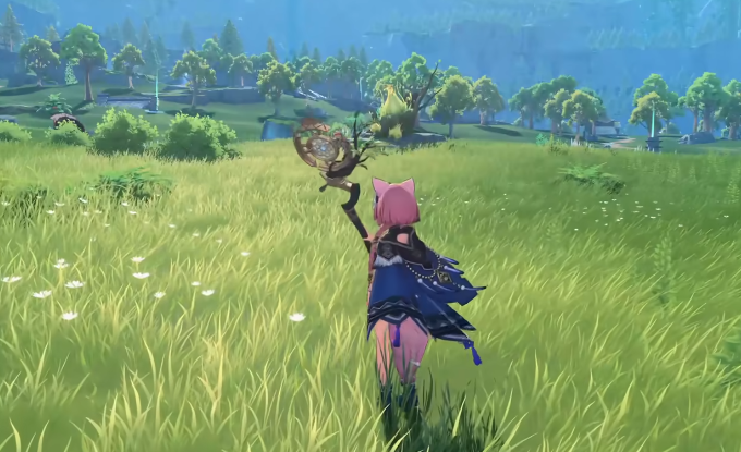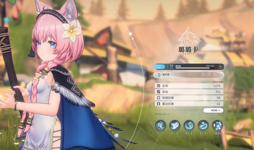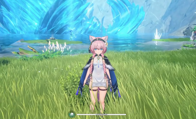 璐璐卡为水属性限定角色,外观设计以柔美灵动为核心:粉色调发色、垂落耳饰与澄澈瞳色共同强化其亲和力与元素契合度。战斗中手持镰刃,动作兼具流畅性与节奏感。基础连段“涟漪之舞”共四段,前三段为快速水属性魔法伤害输出;第四段支持长按触发蓄力重击,蓄力时长直接决定伤害倍率,最长可叠加至全额增幅。