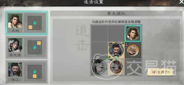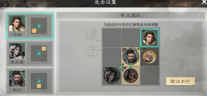 张辽作为该阵容主C,主动技能推荐【白虹贯日】,可对所在横排末位敌人施加高额伤害,并与自身天赋形成联动,提升关键目标点杀成功率;追击技能选用【横刀耀武】,精准打击敌方武力最低单位,补足伤害缺口;被动技能同样配置【白虹贯日】,获得20%暴击率加成,显著增强爆发稳定性。蔡文姬定位为功能性辅助,主动与被动技能均选择【鼎立相助】,虽牺牲部分个人输出,但可为处于追击格的队友提供稳定伤害增益。站位设计上,务必使张辽同时覆盖马超与蔡文姬的追击格范围,确保技能触发频率最大化。