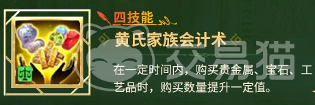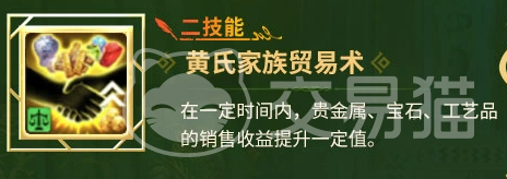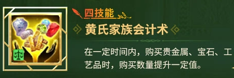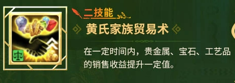 二技能【黄氏家族贸易术】与四技能【黄氏家族会计术】构成完整贸易增益链:前者提升贵金属、宝石、工艺品三类货物的售出收益;后者则提升同三类货物的单次采购数量。双技能协同可显著缩短贸易周期、提升资金周转效率,对专注商路发展的玩家而言,能有效降低装备依赖度,实现更平滑的成长曲线。