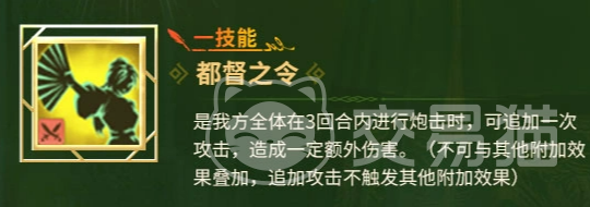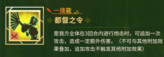一技能【都督之令】可在3回合内使己方全体炮击行动额外追加一次攻击,造成独立伤害。需注意该追加攻击不参与任何效果叠加,且自身无法触发其他附加效果。因此该技能在低干扰、高纯度输出阵容中表现最为稳定,适合集中爆发场景使用。