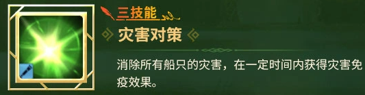 三技能【灾害对策】提供关键航行保障:立即清除全体船只当前所受全部灾害状态,并赋予持续期间灾害免疫效果。该技能在高风险海域探索、长线远航及特定副本关卡中具备不可替代的战略价值,属功能性防御类核心技。
