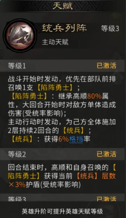 高顺的主动技能可提升全体友军统兵效率,并增加格挡概率,直接强化我方单位(含召唤物)的承伤能力;其觉醒技更赋予部分召唤物额外行动机会,大幅提升单位利用率与战场覆盖率。随着回合推进,召唤物数量呈阶梯式增长,在中后期形成兵力密度优势,为持续压制奠定基础。