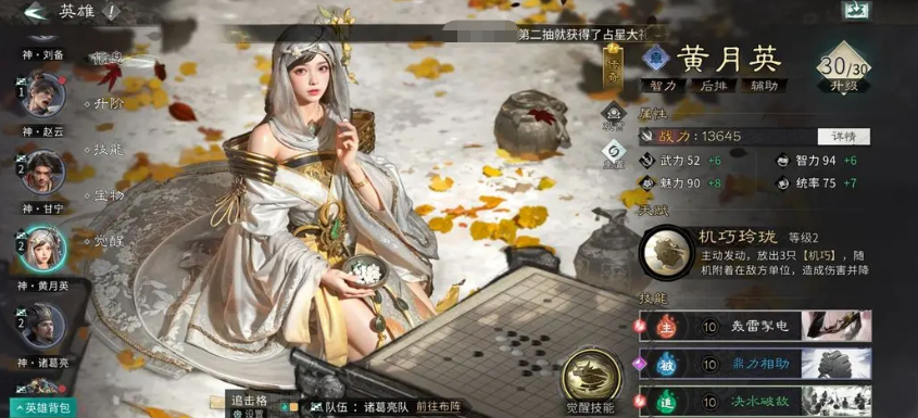 本流派推荐标准配置为:袁绍(红色绝世)、黄月英(绝世)、高顺(绝世)。三者协同可构建稳定、多层、可成长的召唤生态。袁绍作为核心输出兼召唤源,每回合自动释放群体伤害型召唤单位;高顺提供群体增益与召唤物额外行动概率;黄月英则通过“玲珑”天赋生成机巧类召唤物,并对已附着机巧的目标触发伤害增幅。三人技能逻辑互补,共同强化召唤单位的生存、行动频次与输出效率。