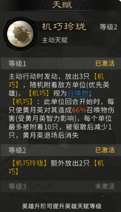 袁绍与高顺的召唤能力在开局即生效,所生成单位可在当回合立即参与行动,形成实质性的先手压制。尤其在敌方未出手前,我方武将+召唤物可完成多段输出循环,显著扩大前期节奏优势。黄月英的“机巧”虽属天赋类召唤效果,但需升至3级方可完全激活增伤机制:当单个目标身上的机巧数量≥2时,所有我方召唤物对其造成的伤害提升;该增益为全局生效,覆盖袁绍箭塔、高顺部曲及黄月英自身机巧,实现伤害乘算叠加。