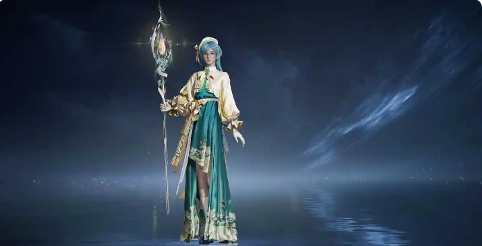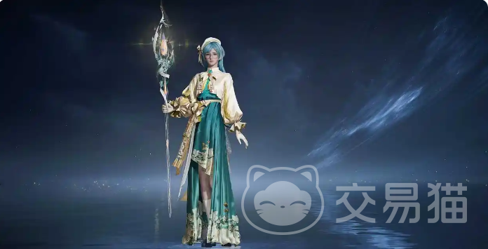 王昭君世界皮肤以中式古典美学为核心,暖金与翠绿配色典雅庄重;发型为垂腰长发,身着改良马面裙与立领上衣,手持星盘法杖,周身环绕浮动星光粒子,整体造型兼具仙逸气韵与学者风范,与其冰系法师、智慧谋士的角色设定高度统一。