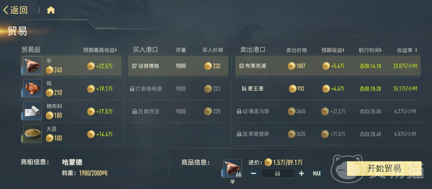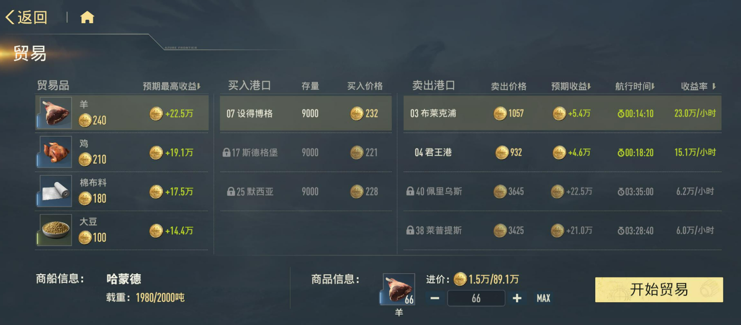 金币类资源的高效补充方式首选远洋贸易系统。该功能开启后,可派遣货船执行跨港运输任务,全程支持离线运行。初始配备两艘货船,后续三艘需随进度逐步解锁。船只等级越高,单次载货量与结算收益越可观,因此应优先投入资源提升大型货船等级。在航线选择上,优先匹配距离短、价格差大的港口组合;若恰逢限时贸易加成活动,则集中调度全部船只跑高价值路线,收益增幅显著。