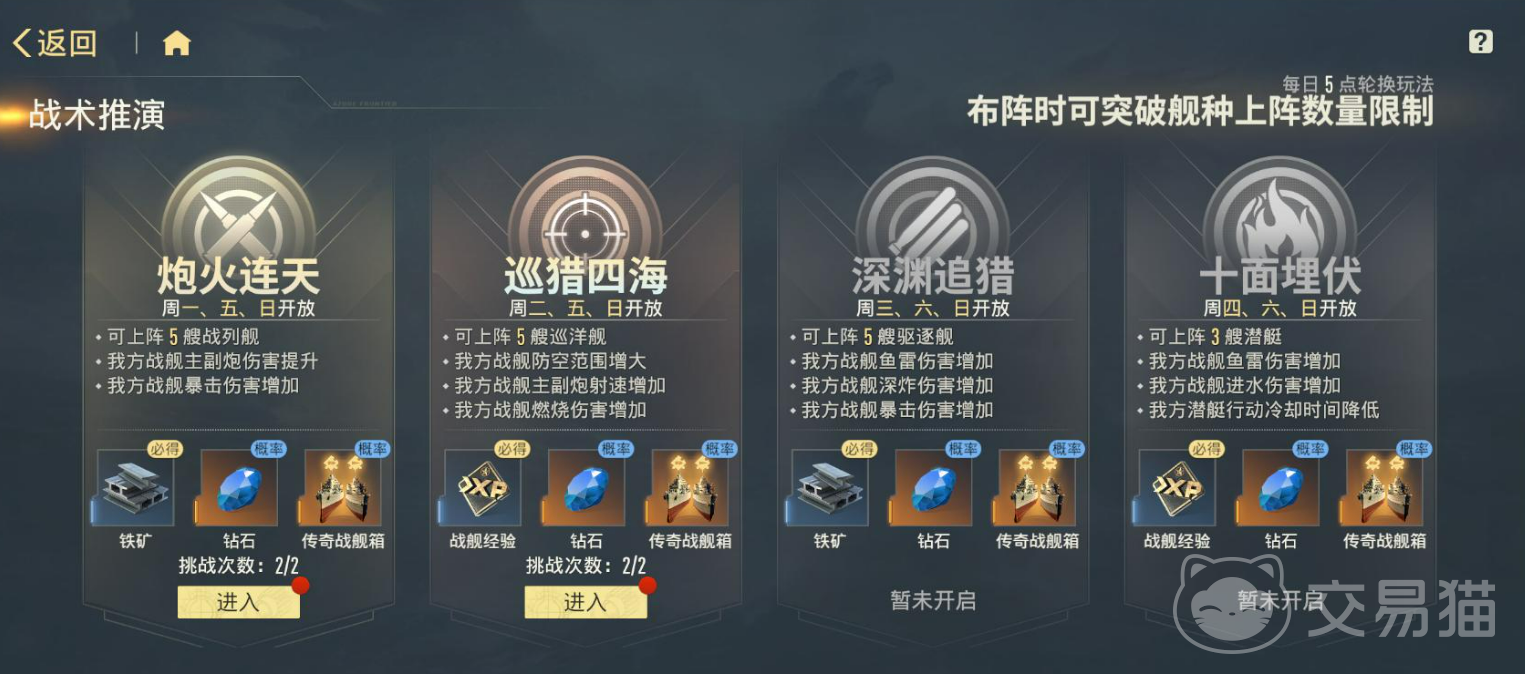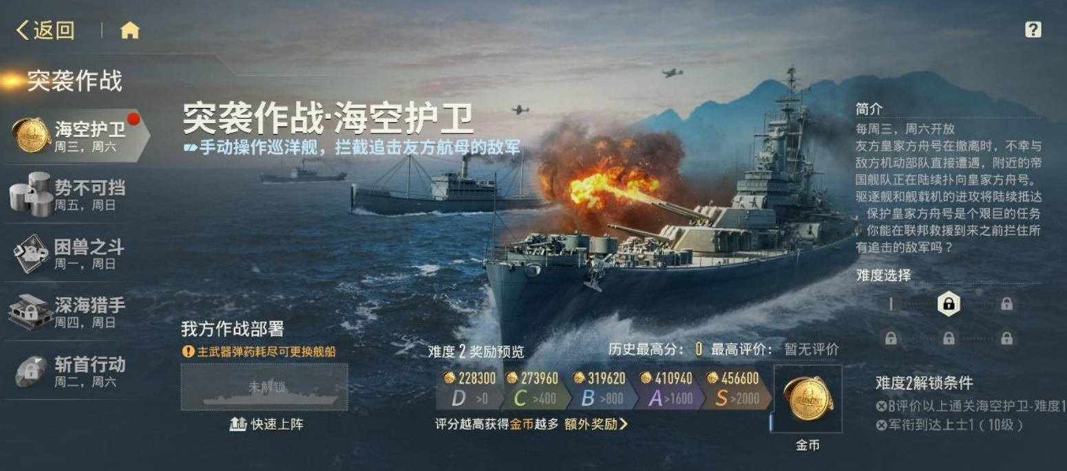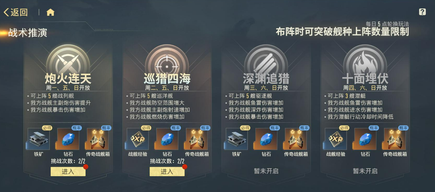 每日例行事项不可忽视:日常任务全部完成后,可获得蓝钻、金币与体力奖励,其中蓝钻为零氪玩家获取新舰的核心途径;资源副本设有双倍掉落时段,当日体力应集中投入对应关卡,实现收益最大化;战术推演每周轮换开放舰种专属材料副本,需根据当前培养目标定向刷取;周常任务虽耗时较长,但奖励丰厚,务必于每周重置前完成清空。