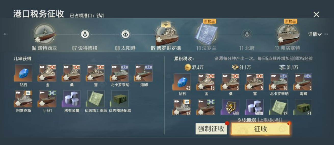 港口税收是全游戏中最基础、最稳定的被动收益来源。完成主线章节即可解锁新港口,每座港口按固定周期自动产出金币、铁块及稀有金属。随着占领数量增加,单次征收总量同步提升;同时,对已占领港口进行升级,可直接提高单位时间产量。需注意的是,各资源存在存储上限,闲置过久将导致溢出损失。建议养成每4–6小时登录收取一次的习惯,确保产能不浪费。