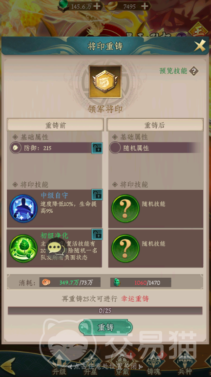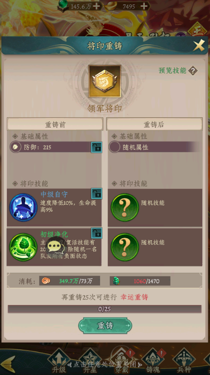 铜钱与玉玺是贯穿整个新手阶段的两大核心资源:玉玺广泛用于商城兑换时装、战法、勋章等关键养成内容;铜钱与玉玺共同构成“将印重铸”系统的消耗基础。该系统能直接突破武将基础属性上限,对战力跃升具有决定性作用,务必有规划地积累并合理使用这两类资源。