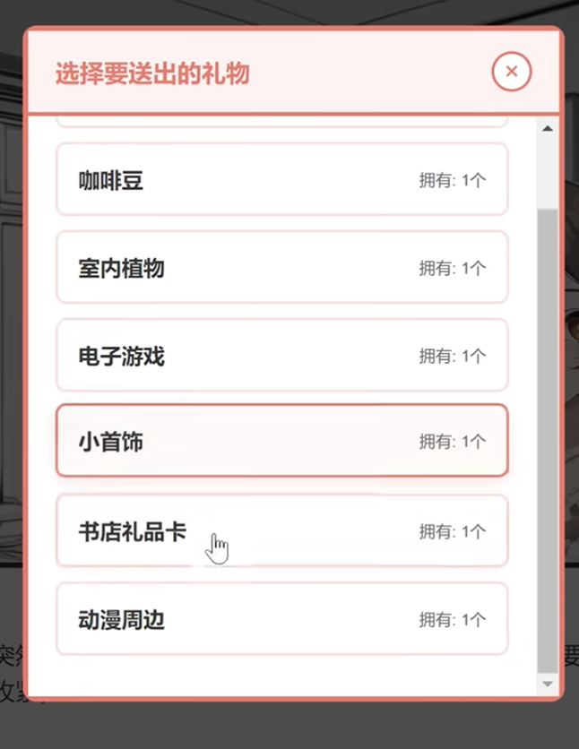 礼物体系划分为三大层级:基础型、情境型与智能型。基础型涵盖巧克力、书籍、甜品、咖啡豆、室内植物、小首饰、书店礼品卡、动漫周边等常规物品,每类均有固定数值影响——例如甜品提升好感度+4,书籍+3;而错误选择如五年高考三年模拟则导致好感度下降4点。情境型礼物强调时空适配性:清晨赠送草莓蛋糕可强化亲密度,雨天递上雨伞将触发限定语音。性格维度亦具差异化响应逻辑——傲娇属性Yuki显著倾向甜品类馈赠,可爱属性则对小首饰反馈更积极,需依据当前人格标签动态调整策略。