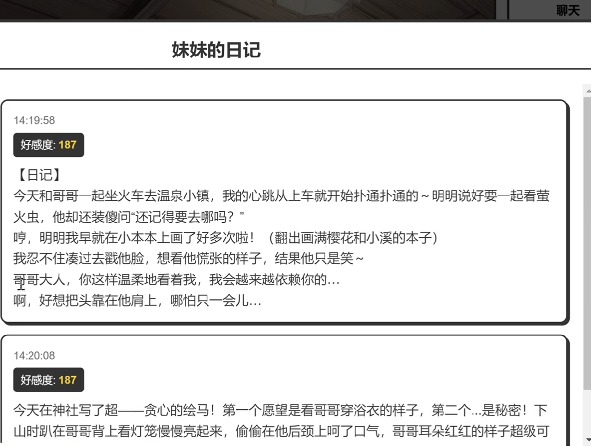 旅行结束后自动生成的Yuki日记,是承载情感记忆的重要载体。例如其中一段写道:“和哥哥一起坐火车来温泉小镇,心跳从上车开始就‘扑通扑通’跳个不停~下山时趴在他背上,看着灯笼一盏盏亮起,悄悄对着他后颈吹了口气……哥哥耳朵红红的样子,真的好可爱~”此类文本以第一人称视角还原心理细节,既映射好感变化轨迹,也为玩家提供复盘与共情支点,加深对角色内在动机的理解深度。