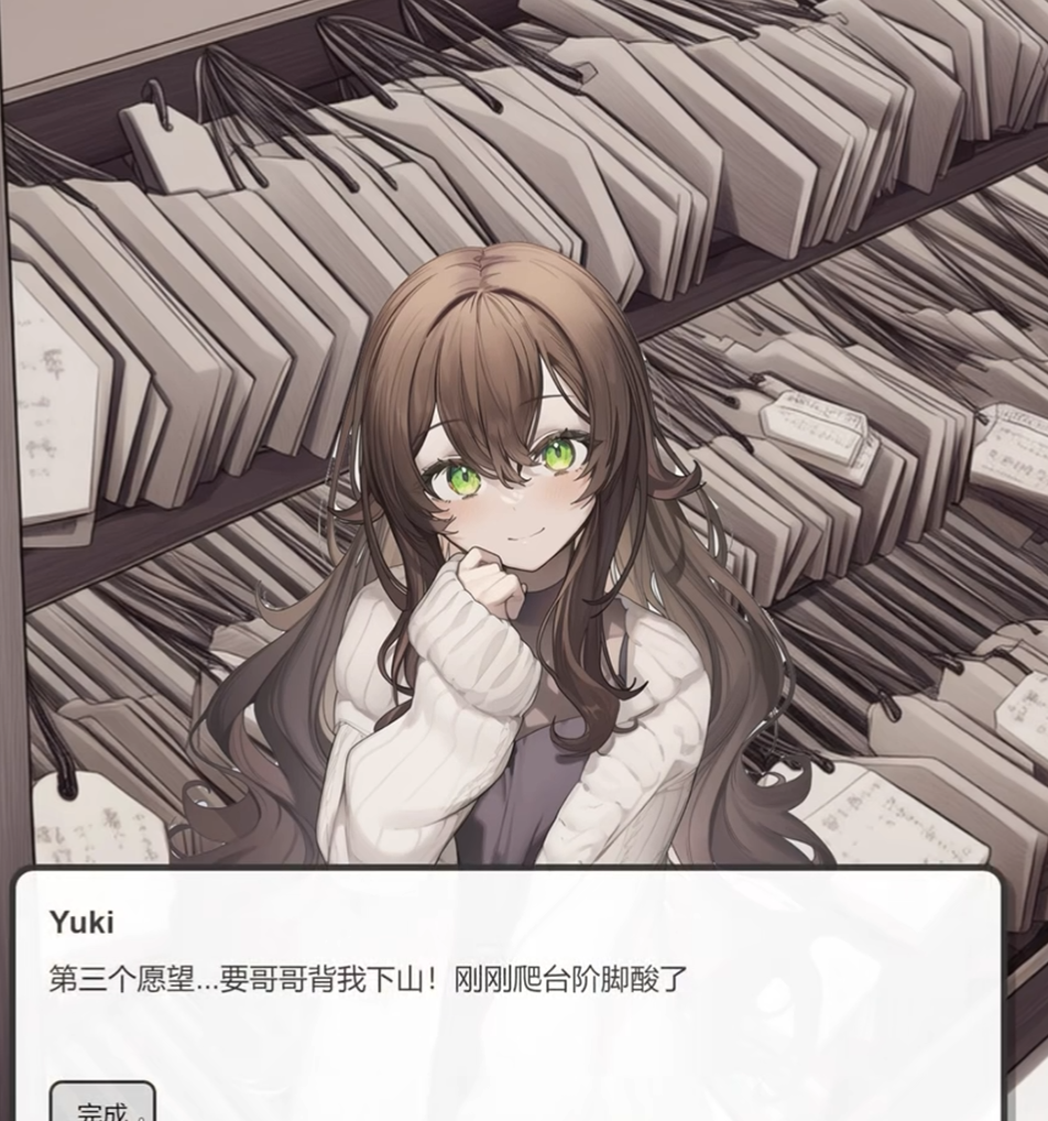 抵达温泉小镇后,开放区域包含神社等标志性场景。在神社参拜环节,Yuki将提出第三个许愿内容:“哥哥背着我下山!刚刚爬完台阶脚就酸了。”该任务兼具生活化表达与明确操作指引,将观光行为转化为可执行、有反馈的轻量目标,既降低理解门槛,又借由肢体依赖强化亲密感。完成动作后不仅获得即时奖励,更会在Yuki个人日记中生成对应记录,形成“行动—反馈—沉淀”的情感闭环结构。