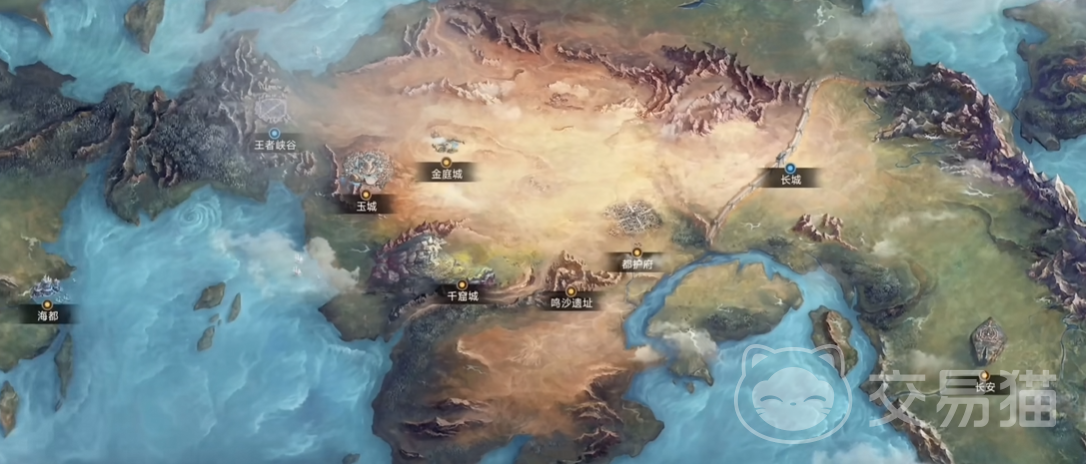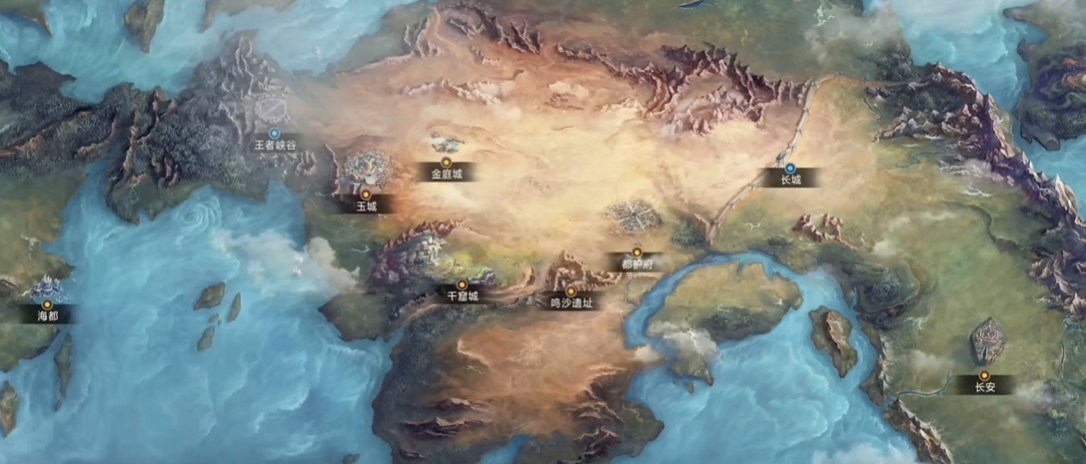 西部与北部构成大陆的外围疆域:“日落海”位于西北沿海,属海洋文明聚落,采用西方奇幻视觉语言,核心场景包括海都、日落圣殿及王者峡谷;“北荒”地处长安正北,呈现冰原与荒漠交织的严酷地貌,气候苦寒,人迹稀疏;而“大河流域”即云梦泽,位于稷下以南,是一片典型的亚热带沼泽湿地生态系统,植被茂密、水网纵横。