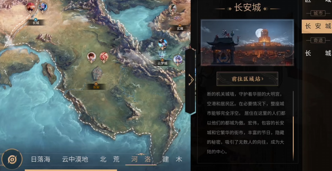 除洛河外,中部还涵盖“稷下”——以学术争鸣与机关术见长的学府重镇;以及“云中漠地”——融合西域风情与沙海生态的广袤边疆地带。