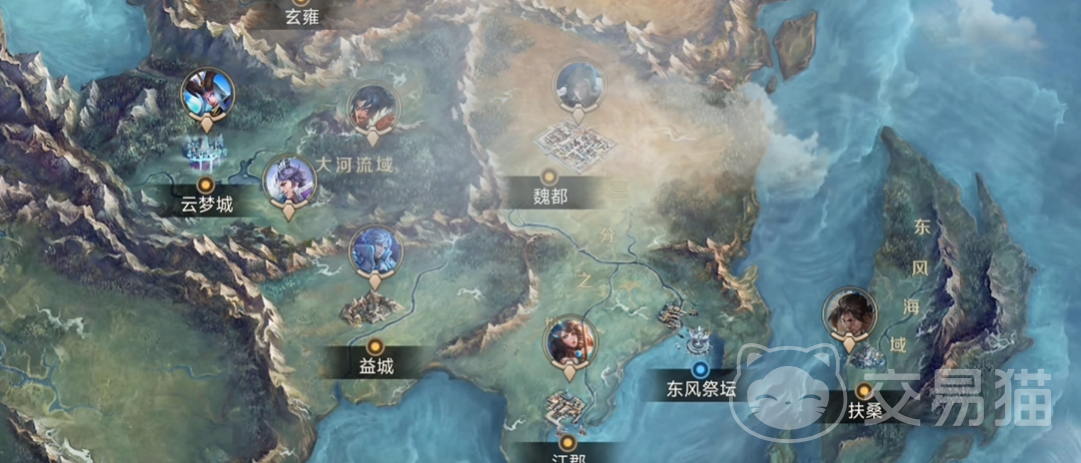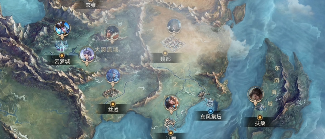 东部区域由两大部分构成:其一是“三分之地”,地处大陆东南,为新手起始区域,深度融合三国历史元素,涵盖水乡聚落、军事关隘与经典战场场景,代表性地标包括赤壁、长坂坡及魏蜀吴三方主城;其二是“东风海域”,覆盖三分之地外围群岛,包含潮汐峡谷、深海秘境等动态海洋地貌;再向北延伸即为“建木”,一座悬浮于空中的上古神域,整体呈现华夏早期神话美学风格。