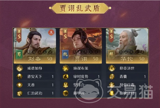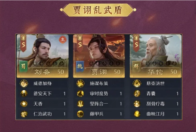 在队伍配置上,贾诩与刘备、华佗形成高兼容性组合——刘备稳定提供怒气支持与减伤护盾,华佗强化续航保障,三者协同可有效限制诸葛亮、张郃等依赖技能节奏的对手,显著提升整体容错率与控场稳定性。