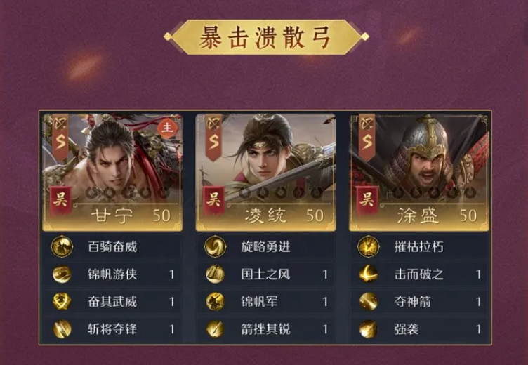 徐盛与甘宁、凌统构成典型吴国速攻体系,甘宁提供先手爆发与机动扰动,凌统强化连击频率与群体压制,三人配合可快速瓦解敌方前排承伤结构与后排输出环境。