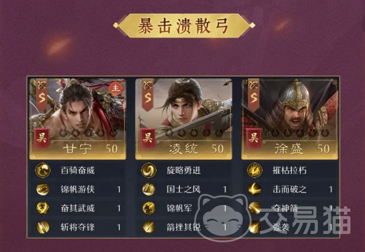 吴国名将徐盛,主将技【摧枯拉朽】造成武力伤害的同时,可持续6秒削弱全体敌方武将统率;固有技【击而破之】则在提升自身暴击率基础上,同步降低目标部队全体敌人统率,并附加武力伤害。该双段统率压制机制,使其成为破防体系中的核心输出节点。