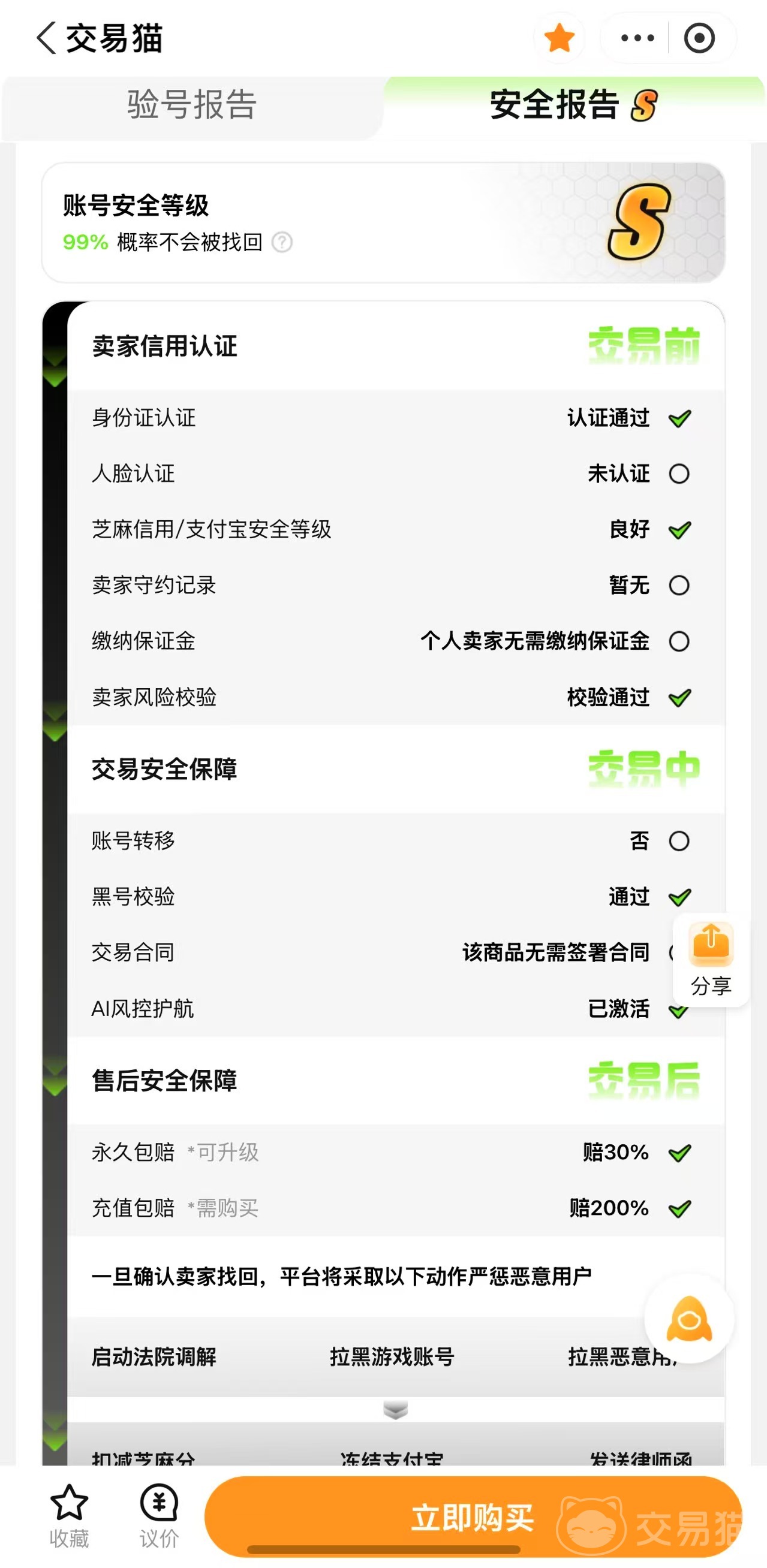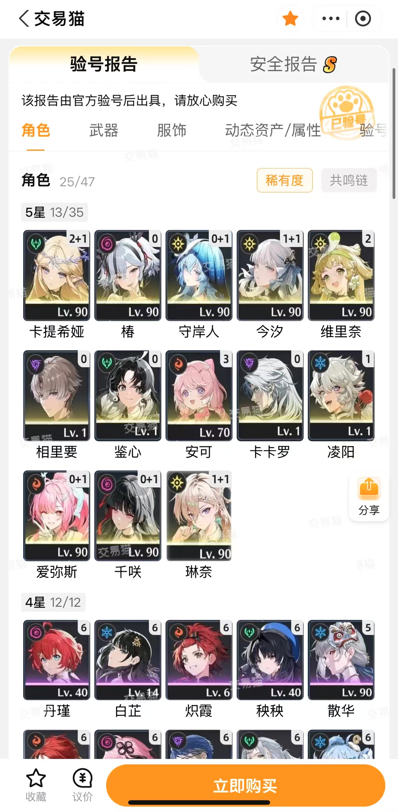 平台有官方验号,卖家上传好相关的截图和账号的实际情况,买家看号只需要点击商品的详细信息就可以看到具体的角色,武器服饰等资产。验号工作人员会逐项认真核对角色、共鸣等级、材料库存等,给出真实完整的验号报告。有了验号报告,账号更加好卖,也不会因信息不符双方闹纠纷。