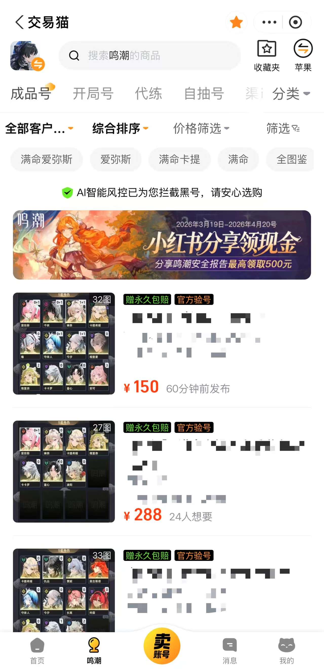 玩家花时间肝的高共鸣等级、满命SSR(守岸人、今汐、折枝这些)、极品毕业声骸、全图鉴收集、大量抽卡资源,都是真金白银和精力堆出来的。放着吃灰确实市太浪费了,卖了变现才划算。但卖号最怕遇到骗子、信息不对、纠纷扯皮,所以必须选正规平台。交易猫就是鸣潮玩家卖号的首选,安全、快捷、有保障。而且交易猫是阿里巴巴灵犀互娱旗下平台,也是业内唯一全场送永久包赔的,有着大厂背书安全拉满,根本不用担心交易会出问题。安卓用户直接点上方的按钮下载交易猫APP,iOS用户用浏览器打开交易猫官网就能用。