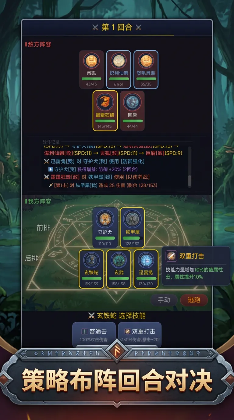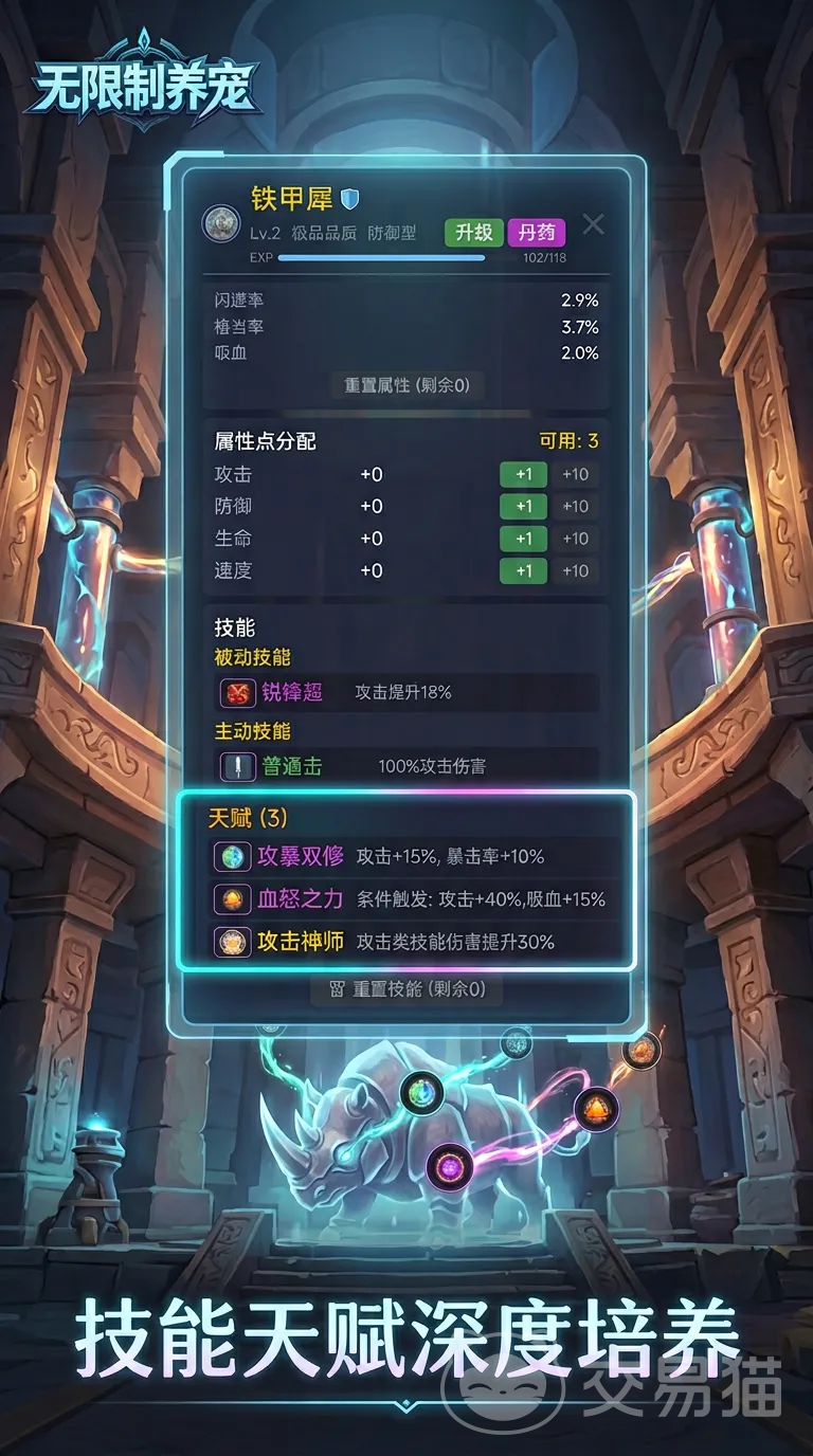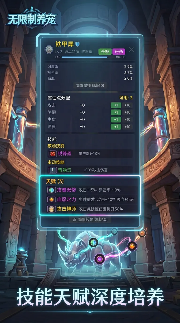 实战环节强调策略性布阵逻辑:前排配置高防御型宠物承担伤害,中后排则安排远程攻击或辅助类单位,形成层次分明的输出梯队。随着宠物图鉴不断扩充,系统将解锁对应成就奖励;每只宠物均支持天赋重置、属性点自由分配及技能树深度定制,确保个体战力可精准适配不同战斗场景需求。