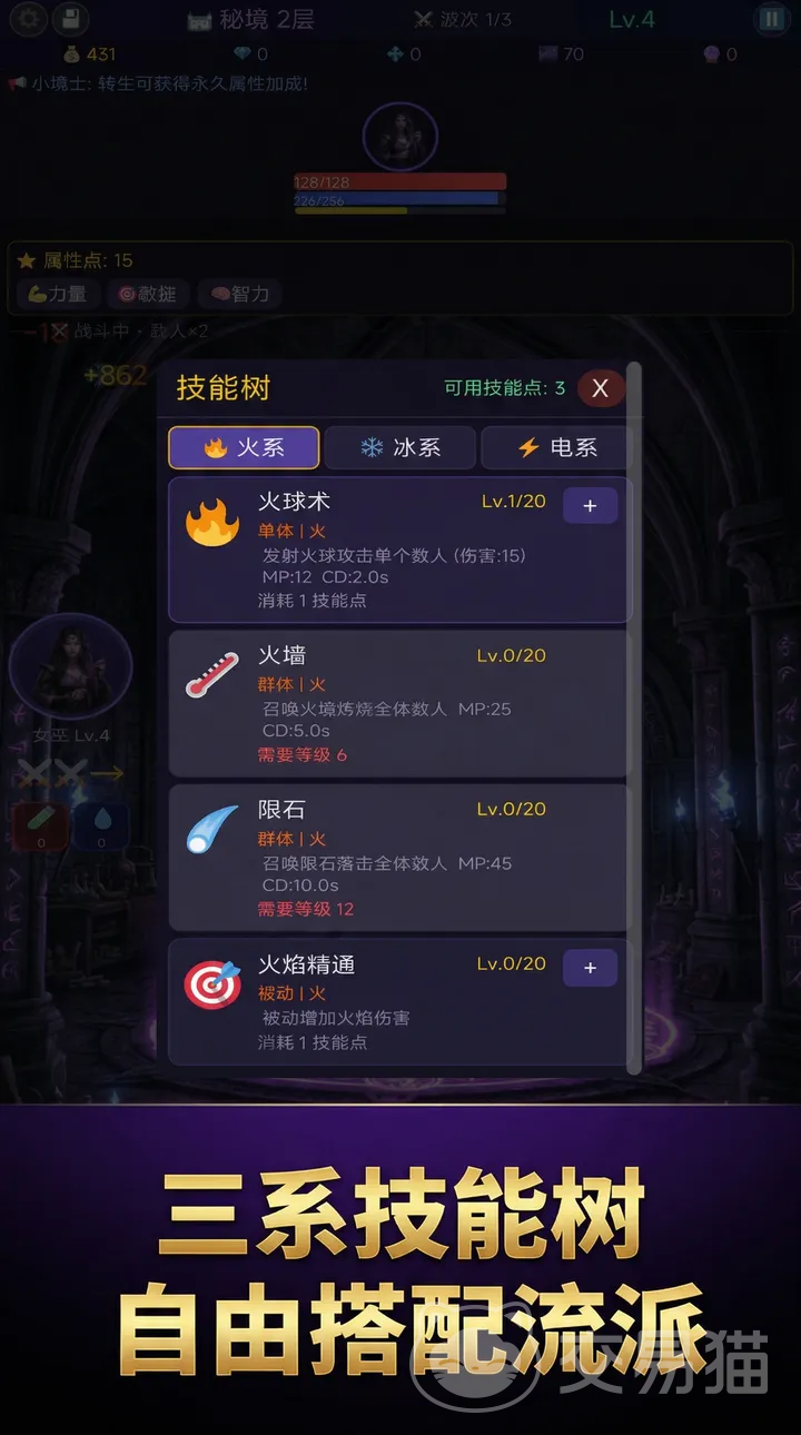角色培养体系围绕三系技能树展开:火系侧重单体爆发与范围灼烧,野蛮人职业以高物理暴击与破甲能力见长,召唤系可同步操控三只亡灵单位形成战术包围,此外还支持元素混伤、攻守兼备等复合流派构建。技能组合逻辑强调资源管理与时机判断,非单纯数值堆砌。
