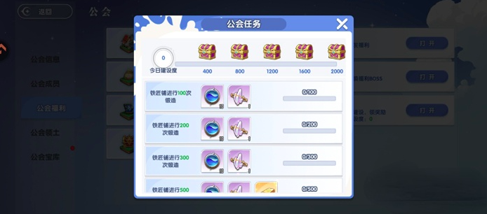 公会福利区为常驻开放区域,支持随时进入并接取任务。当前每日刷新的常规任务需前往指定地图点位完成,如铁匠铺、维克多农场等。每项任务完成后可获得100至500点不等的建设值,累计满400点即可激活一个宝箱。该机制强调日常参与稳定性,避免资源断档。所获宝箱内含经验值、钻石、背饰及各类装备武器,均为角色日常升级与外观养成不可或缺的基础资源。