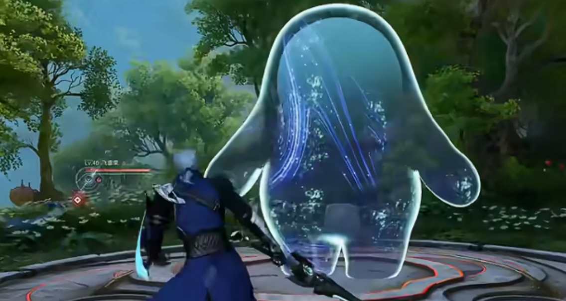 河道巨灵是地图河道区域特有的动态环境实体,外观呈半透明果冻状能量聚合体,泛有柔和辉光,沿预设路径缓速行进,终点为发光法阵。它不具备敌对AI,不会对角色造成威胁,其存在本质是引导型资源触发装置——玩家通过持续攻击可提升其移动速率,确保其顺利抵达法阵并完成转化流程。