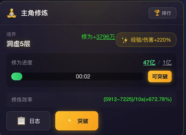 游戏完整构建了从凡胎俗体到渡劫飞升的修仙长路,涵盖筑基、金丹、元婴、化神直至大乘飞升的全阶段成长体系。战斗系统支持全自动运行,掉落物智能识别拾取,修为增长与境界晋升均由系统实时演算并同步生效。