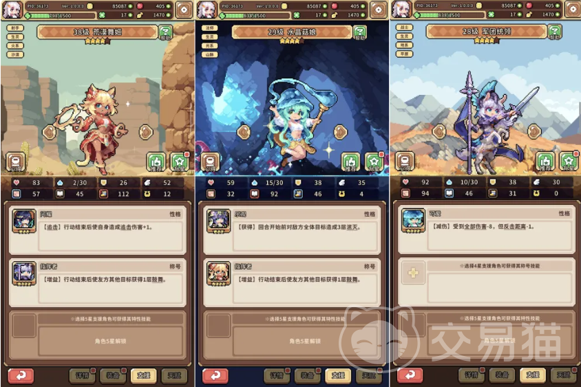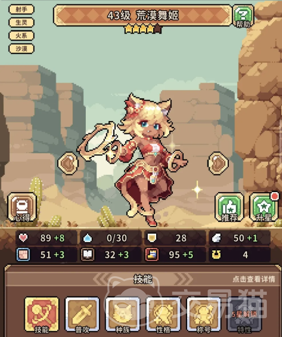 推荐起手阵容为:荒漠舞姬(火猫)、水晶菇娘、军团统领(人马)。三者均为前期高获取率角色,无需依赖稀有抽卡或复杂养成即可快速成型。其中,荒漠舞姬为核心输出兼功能枢纽——其“闪耀”技能可在行动结束后触发多次追击,并为全体友方附加1层鼓舞;水晶菇娘则在首次攻击命中时施加3层“泯灭”状态,同步扩散鼓舞效果;军团统领提供稳定的群体减伤(-8点固定伤害),虽反击距离-1,但作为前排承伤与节奏调控位仍具不可替代性。需特别注意:荒漠舞姬是整套体系的强度支点,不仅输出上限最高,后期还承担全队回蓝职能,建议优先升至4星并重点培养。