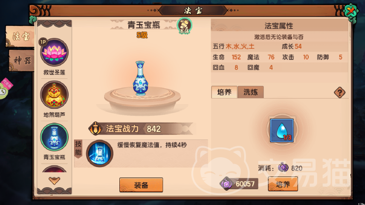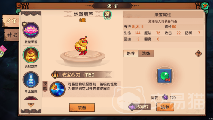 游戏中法宝按五行划分为金、木、水、火、土五大类,各类属性对应差异化增益:金系强化攻击力,木系提升法宝技能威力并缩减冷却时间,水系扩充法术值上限,火系增强角色生命值,土系则侧重防御力加成。地煞葫芦独有木、土双属性,使其在输出效率与生存能力上实现协同提升。