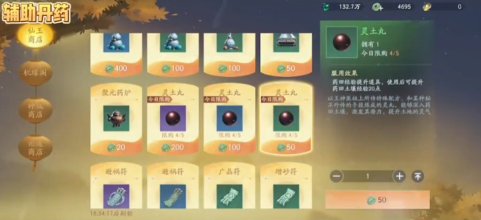 辅助类丹药当前仅有一种——灵土丸。该丹药不可炼制,仅能通过限时福利活动或仙玉商店兑换获取。其唯一功能是提升药田等级,而药田等级直接决定高阶灵药的种植资格与产出品质,是构建可持续丹药供应链的基础环节。