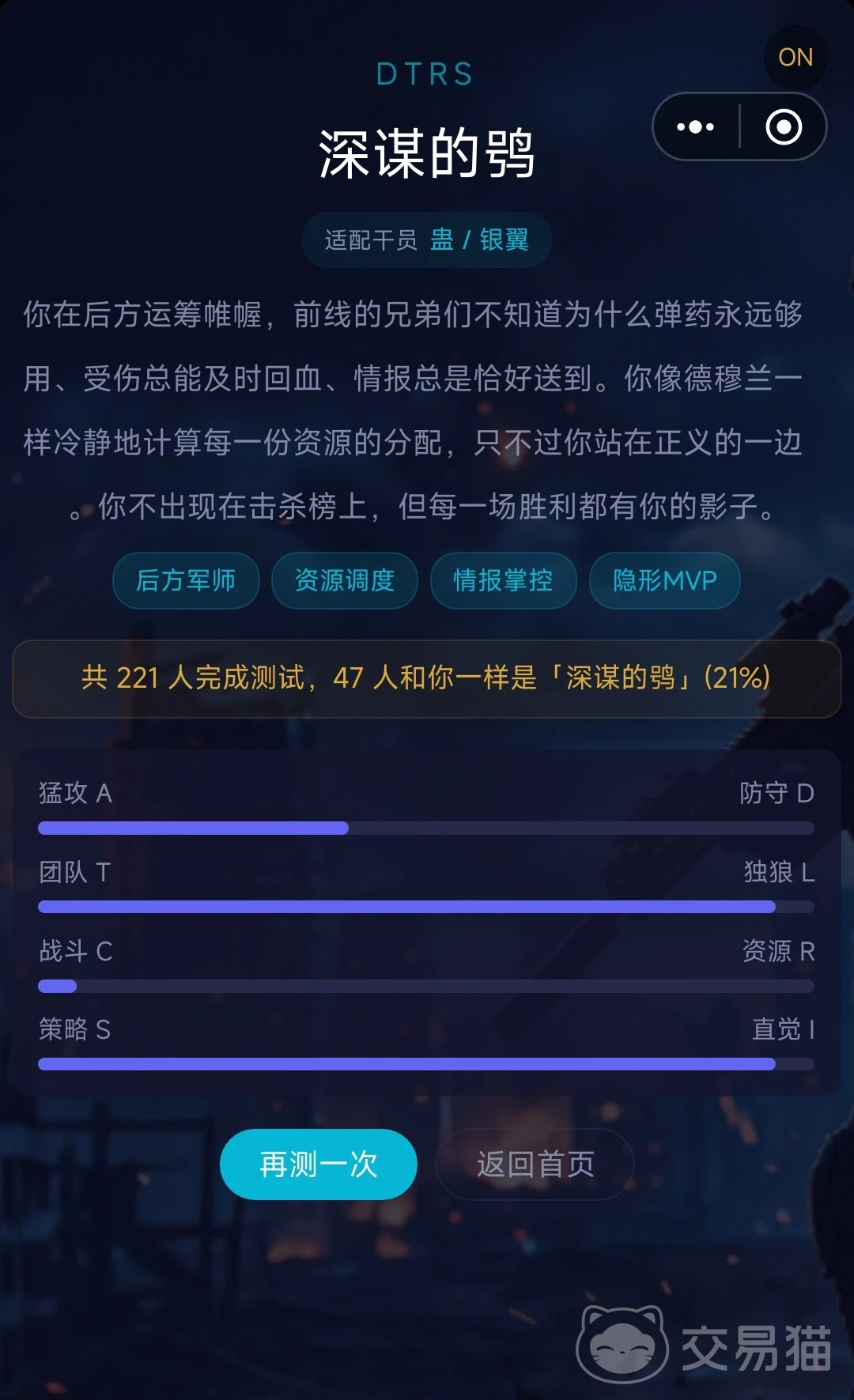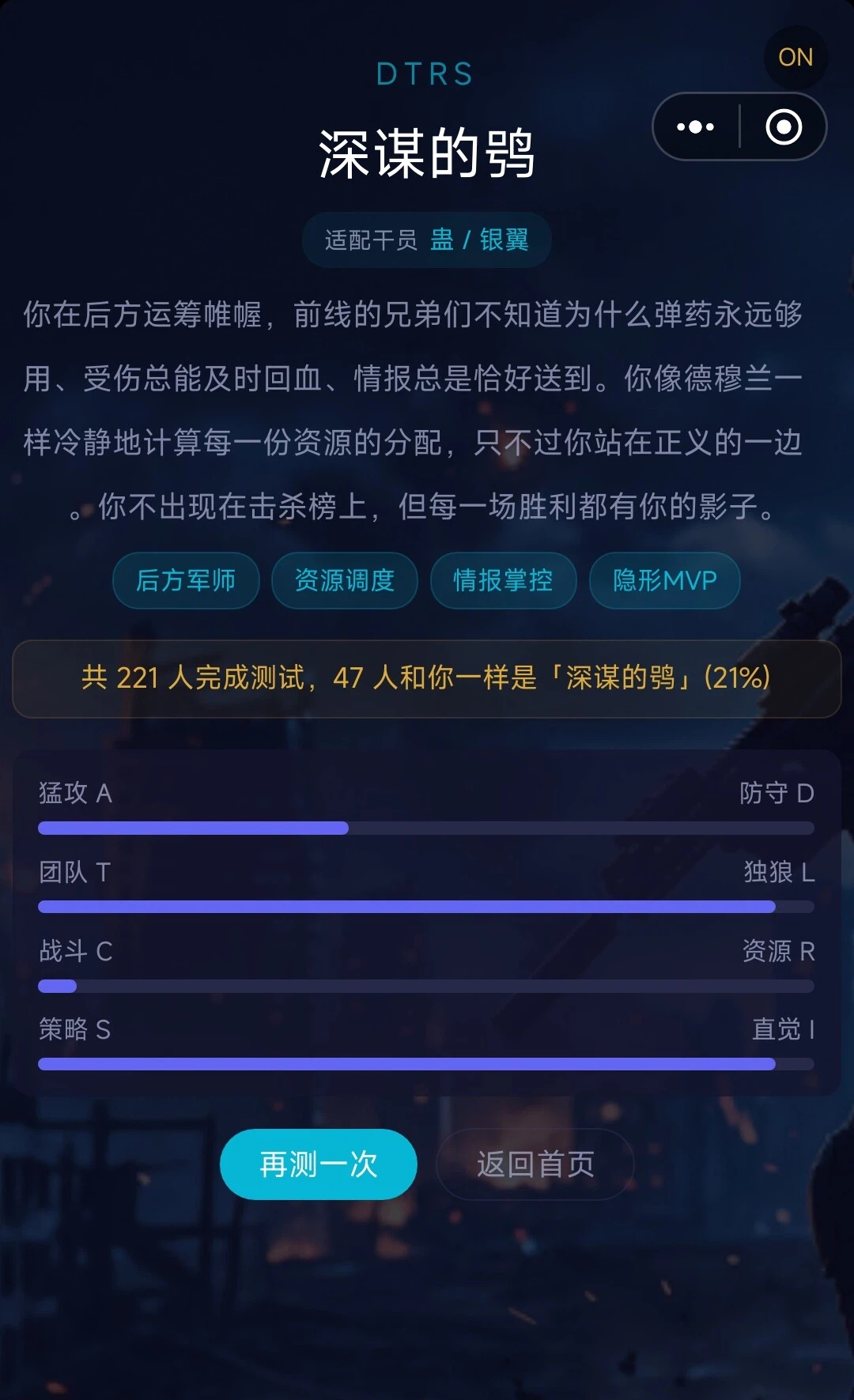 结果页不仅解析人格特质,还结合《三角洲行动》实际玩法,推荐适配的团战职能:例如“深谋的鸮”类型玩家被建议承担后方指挥、资源统筹与情报分析任务;而“迅捷的隼”则更适宜担任突击位或快速侦查角色。这种基于心理画像的策略建议,有助于新手快速建立战术意识,也能帮助老玩家优化队伍配置逻辑。