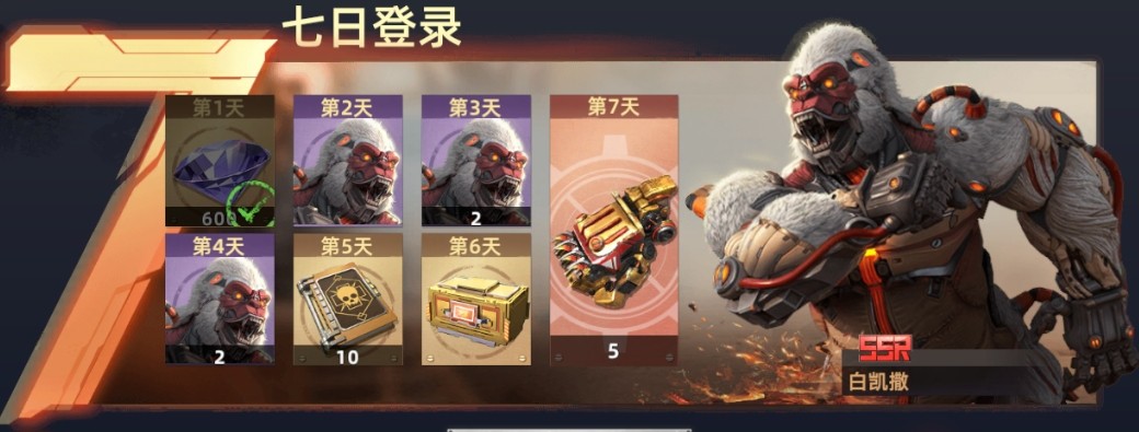 连续7天登录即可领取阶梯式奖励,总计含钻石*600、SSR巨兽【白凯撒】、SSR级巨兽探险技能书、骑兵史诗机甲宝箱、白凯撒专属武器碎片*5。