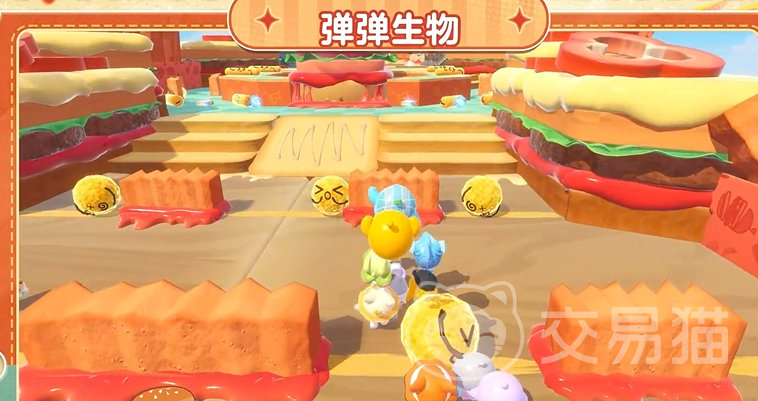 竞速关卡「弹弹生物」:赛道布满拟人化零食元素,包括弹跳薯球、滚动荷包蛋与滑行香肠等动态障碍物。玩家需灵活闪避碰撞,一旦接触将被强力弹飞,最终以最快抵达终点者胜出。