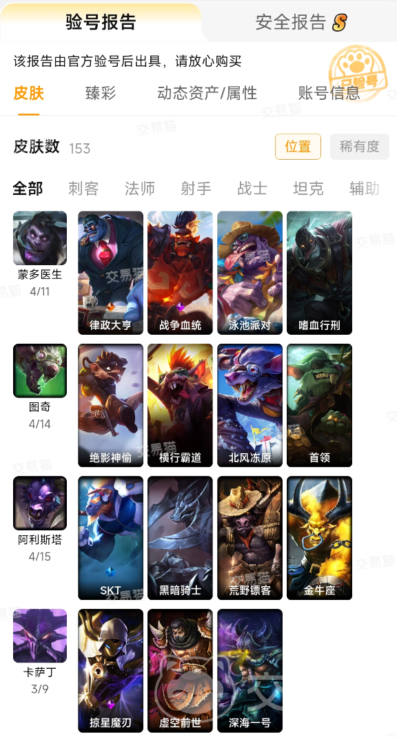 玩家选购《英雄联盟》账号的核心诉求集中于高价值皮肤与稀有英雄,尤其是已绝版的限定款皮肤(如源计划、K/DA系列、星之守护者等),其收藏与实战价值远超普通皮肤。交易猫支持LOL官方验号服务,卖家可自愿发起验证,经平台认证后,商品页将结构化展示账号内全部皮肤数量、稀有度等级、是否绑定手机、是否开启双重验证等关键信息,确保资产状态透明可查,大幅降低交易信息差。