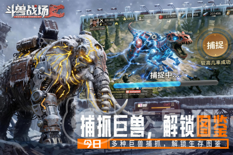 游戏核心围绕“捕获—培育—部署”三重循环展开:广袤辐射荒野中游荡着搭载合金装甲的史前巨兽,包括强化型霸王龙、高速空袭翼龙等多类单位。抓捕过程摒弃一键自动机制,需玩家预判移动轨迹、规避范围攻击、把握眩晕窗口,具备真实狩猎的节奏感与操作反馈。成功捕获后,巨兽将进入基地孵化舱,通过基因序列编辑、义体强化及神经适配协议完成定向进化——每只个体可独立配置技能链、属性成长路径与战术定位,不存在数值模板化复刻。