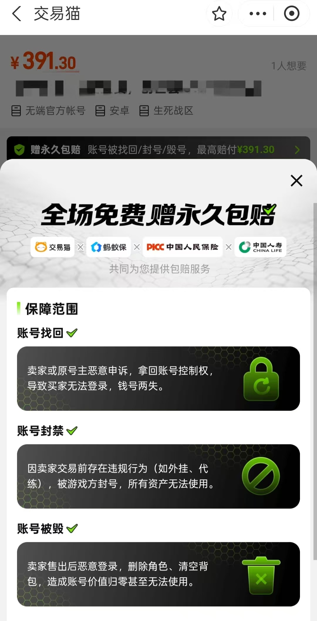 买生死狙击账号,最看重的就是安全问题,交易猫平台在这方面一直做得很到位。所有入驻平台的卖家都得完成实名认证,并公示其芝麻信用,使买家能清楚了解到卖家的信用状态,有效规避跟不可靠卖家交易的风险。而且平台还提供永久包赔服务,若是交易完成后,因为不是买家的原因导致账号被毁、被找回或是被封禁,平台会按照协议进行相应的赔偿,充分保障用户的权益。对于游戏玩家来说,最担心的就是付款后账号因保管不善而丢失,而交易猫在这点上确实很让人放心。