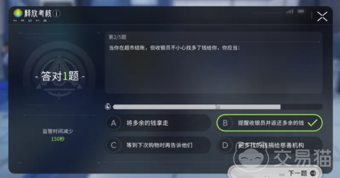 恢复自由需通过“释放考核”。考核内容聚焦现实社会基础规范,涵盖交通管理常识、基础公民道德判断及公共事务应对逻辑。典型题型如:“收银员误多找零一元,正确处置方式是?”仅当玩家选择归还或主动提醒时,方可削减剩余监管时长。此类轻量级知识问答将教育价值自然嵌入惩罚流程,在维持游戏节奏的同时消解负面体验,使监管期转化为认知升级窗口。
