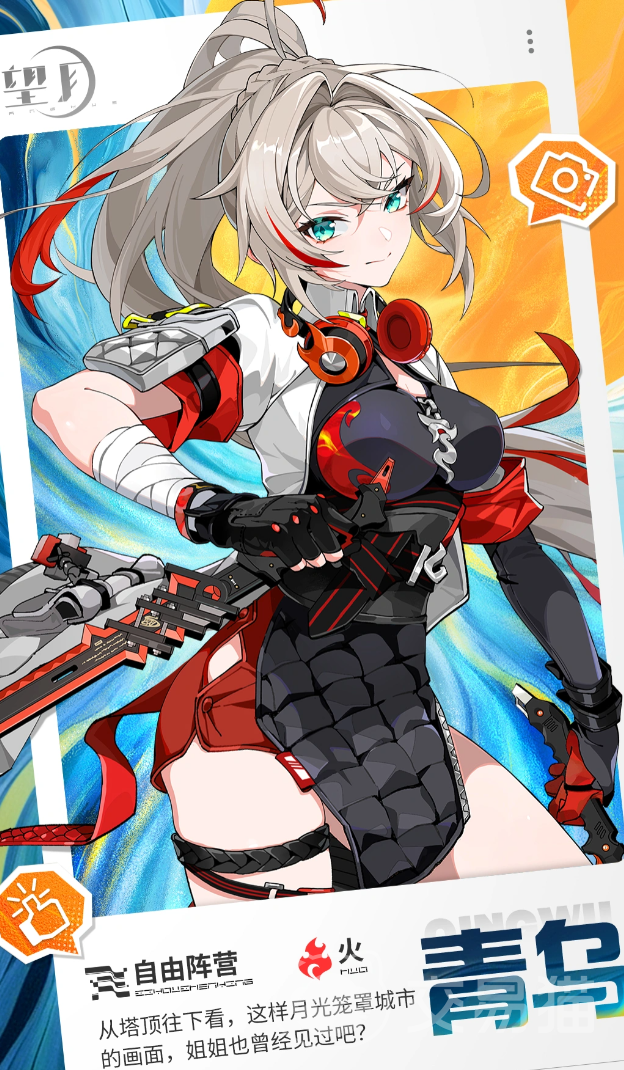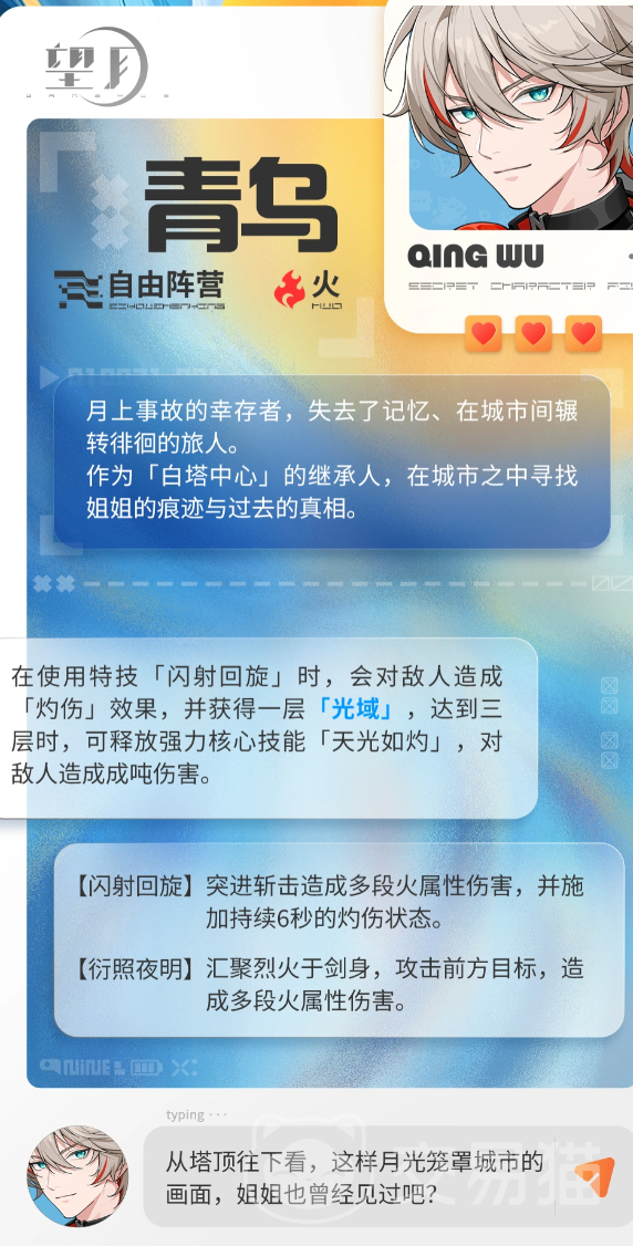养成维度上,青乌归属自由阵营,装备词条与月灵配置需聚焦两大方向:一是提升火属性伤害加成,直接放大技能本体与灼伤效果;二是压缩技能冷却时间,保障“闪射回旋”的高频触发,维持“光域”稳定积累。值得注意的是,“望月”作为贯穿角色记忆的关键意象,未来或将关联专属剧情章节、限定外观或记忆解锁类道具,建议玩家在资源规划初期即关注相关线索收集进度。