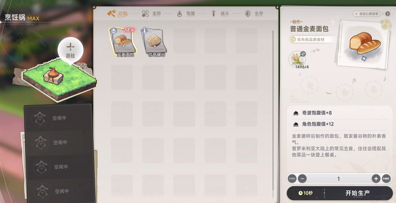烹饪功能需完成前期主线任务后方可解锁,届时工作台与专属烹饪锅将自动加入营地设施列表。进入场景后,点击烹饪锅即可打开料理界面。每道菜品均需消耗特定基础食材,例如普通金麦面包需使用粮草,爆米花则仅需大米。食材可通过采集、击败野外生物、完成委托或商店购买获取。为保障持续产出,建议提前规划资源储备,避免因材料短缺中断烹饪节奏。