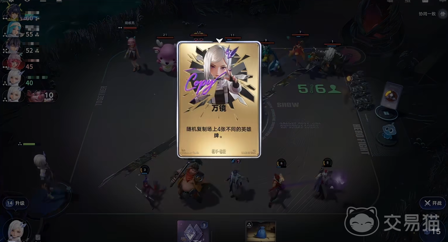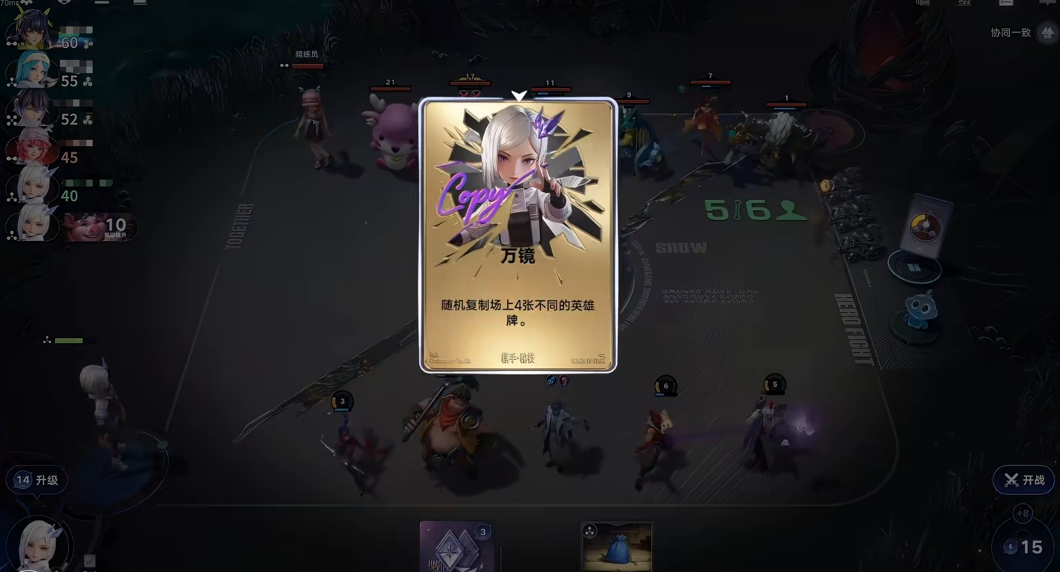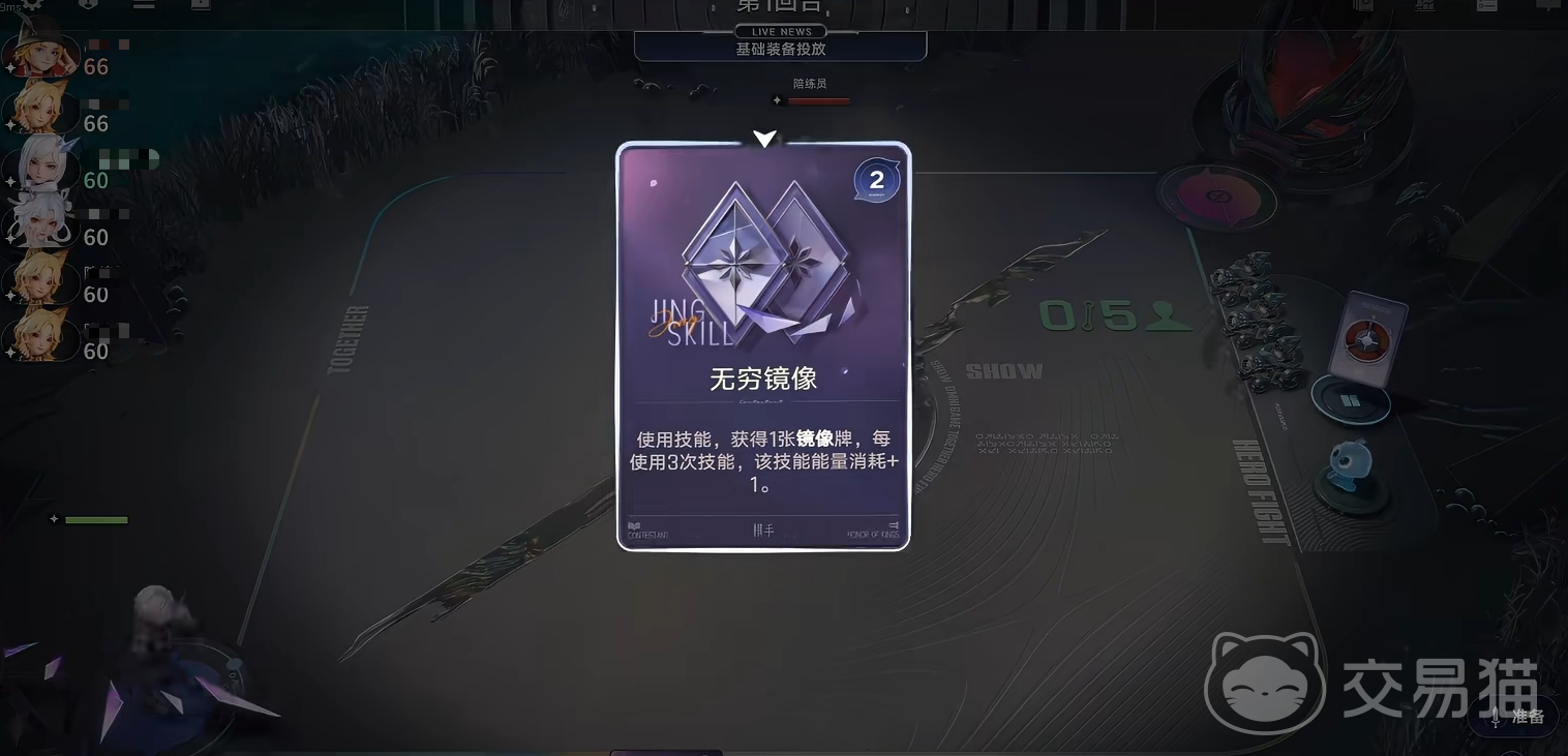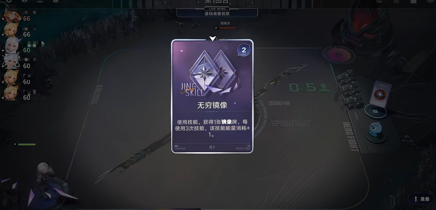 棋手秘技“镜像之力”为进阶能力:当累计打出4张“镜像”牌后,立即获得1张秘技牌“万镜”。该牌可随机复制当前场上任意一名英雄(不含镜像牌),直接补充阵容缺失的关键卡牌,显著缩短英雄觉醒周期,提升整体成型速度。