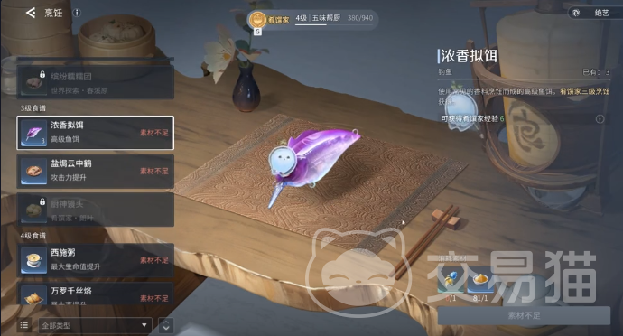 第二项决定性要素是鱼饵匹配度。仅持风波鱼竿仍不足够,必须搭配浓香拟饵方可显著提升褐斑龙鱼的咬钩概率。该鱼饵属于高阶诱食配方,具备定向吸引稀有水生单位的机制特性。制作需前往烹饪台,投入香料鱼粉与鱼果木两种指定原料。实践中常见误区是沿用基础鱼饵,这将直接导致目标鱼种完全不响应垂钓行为,务必避免此类配置失误。